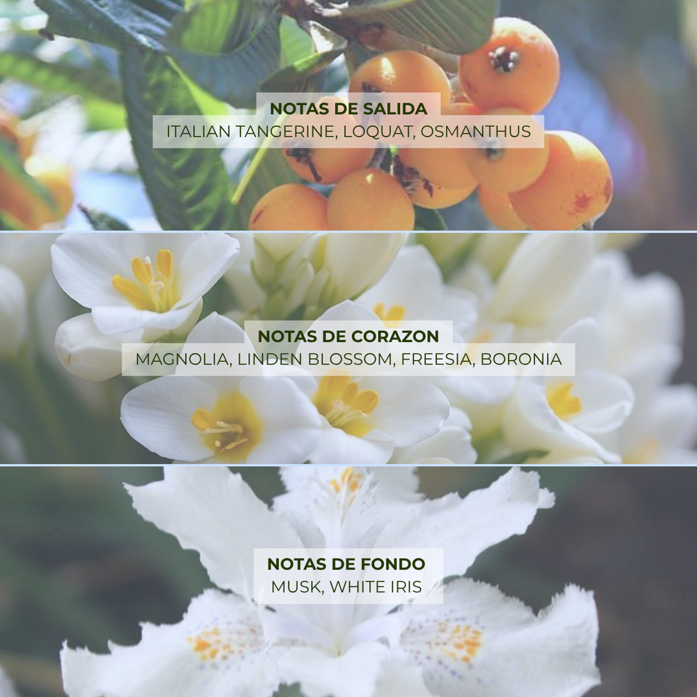 Un Jardín Luminoso Bañado por el Sol. Esta fragancia es un amanecer embotellado. Abre con una salida radiante y jugosa de mandarina italiana y níspero, adornada por el toque aterciopelado del osmanto. Su corazón es un bouquet floral exquisito y complejo, donde la magnolia cremosa y la fresia fresca danzan con la dulzura melosa de la flor de tilo. En el secado, el almizcle y el elegante iris blanco se funden en la piel, dejando una estela de feminidad pura y sofisticada.