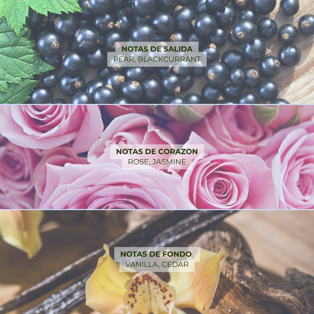 Esta fragancia es la encarnación de un sentimiento que lo consume todo. Se abre con la intensidad jugosa de la pera y la grosella negra, revelando un corazón ardiente de rosa y jazmín. La base de vainilla y cedro sella la promesa de una estela inolvidable. Para la mujer que vive y ama con una intensidad que no conoce límites.