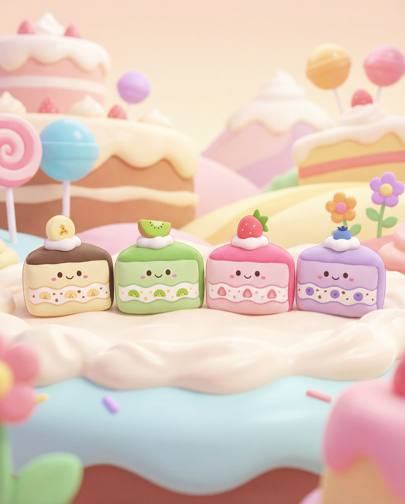 En Candy Valley, los Cakes son los más coquetos: mini tortas en colores pastel con capitas, frutita arriba y carita feliz. Son súper suaves y quedan perfectos para decorar tu cama, escritorio o acompañarte en una siestita. Cada uno trae su “saborcito” visual y esa ternura que te dan ganas de apretar (con amor).