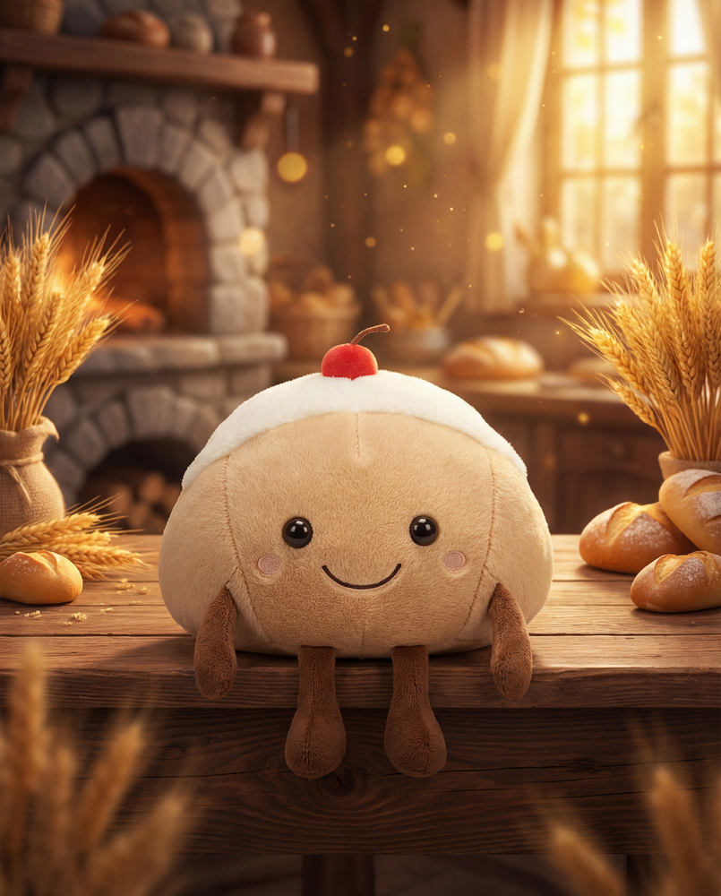 Cuando la panadería se llena de luz doradita y olor a recién hecho, aparece Panchi: redondito, suave y siempre listo para acompañarte. Su “sombrerito” de crema y la cereza arriba son su firma mágica: donde se sienta, baja el estrés y sube el mood. Ideal para abrazar fuerte, decorar tu rincón favorito o regalar como “te traje algo rico… pero para el corazón”.