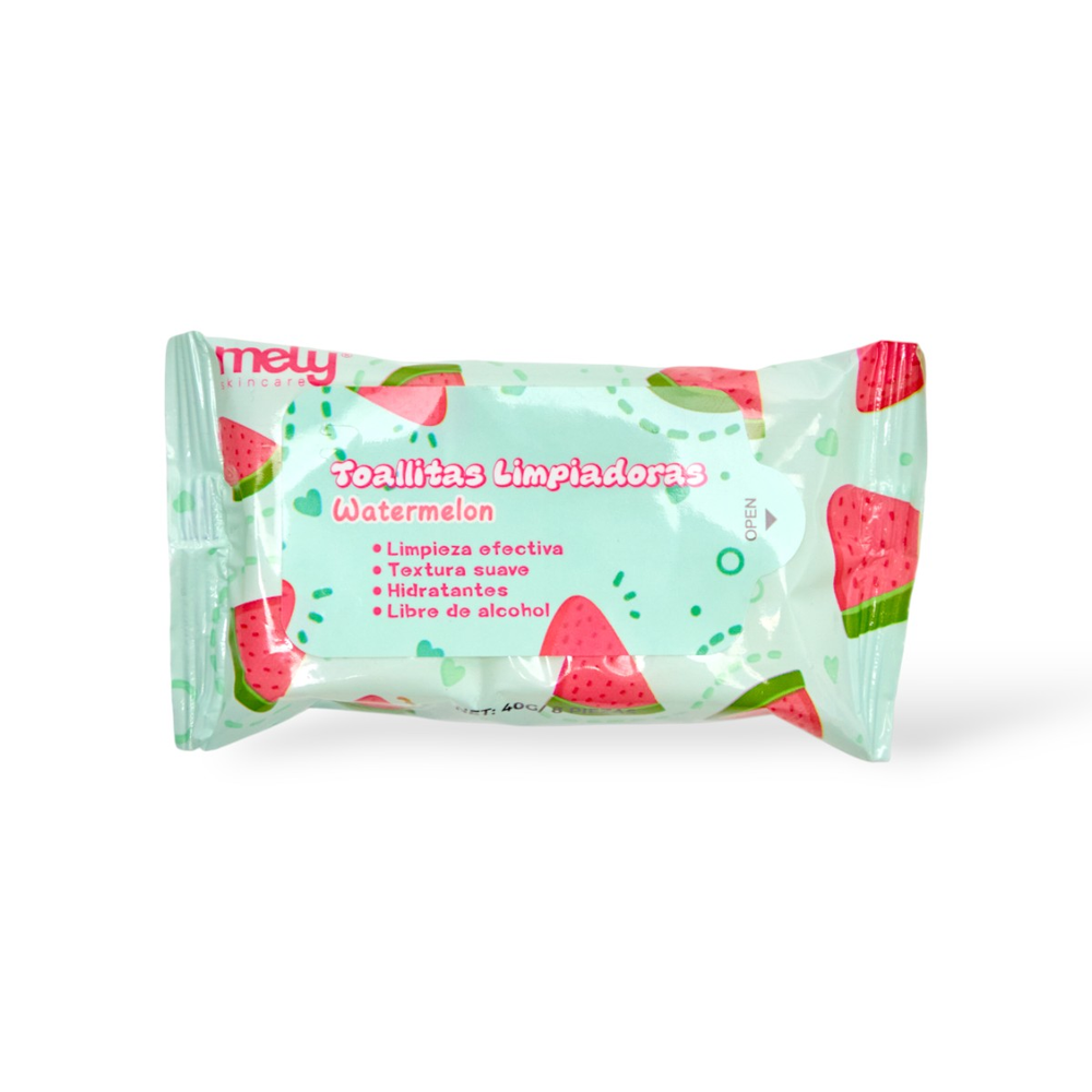 Refrescá tu rutina con las Toallitas de Sandía MELY. Estas toallitas húmedas son un verdadero impulso de energía para tu rostro. Impregnadas en una loción con extracto de sandía, ayudan a remover eficazmente el maquillaje y las impurezas del día, mientras brindan una hidratación ligera y revitalizante. Son perfectas para despertar la piel cansada o para usar en días calurosos gracias a su efecto refrescante inmediato. Su aroma dulce y veraniego te va a enamorar, dejando la piel limpia, suave y lista para descansar, sin sensación pegajosa ni tirantez.